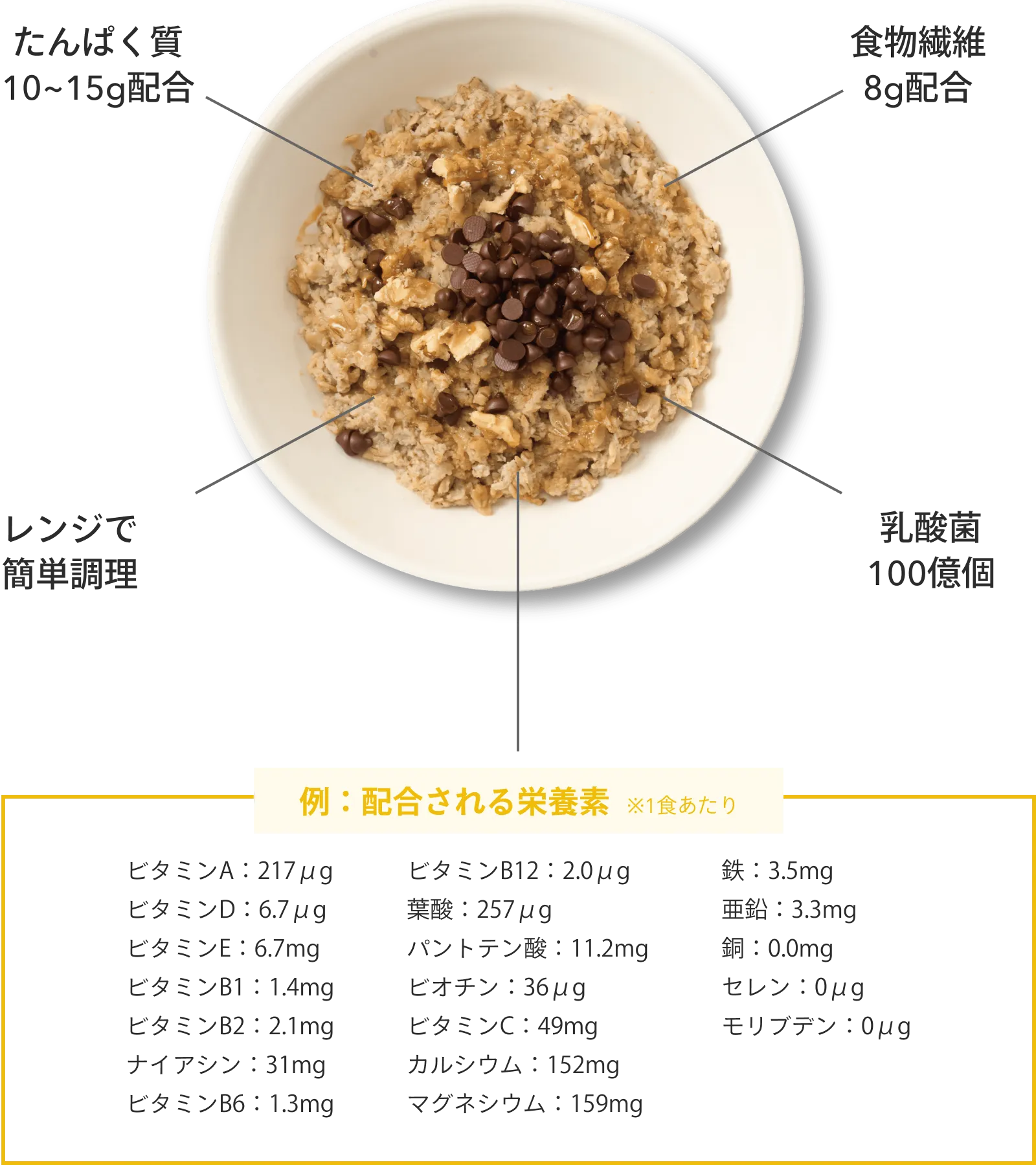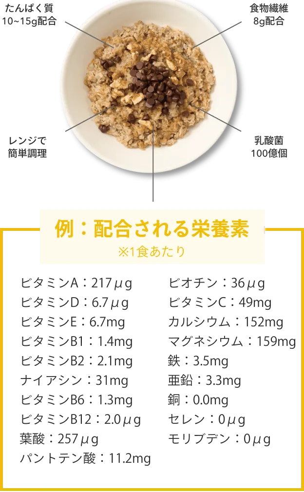 エネルギー 173Kcal 脂質 2.3g 食物繊維 8.7g 炭水化物 28.3g 乳酸菌 100億個 食塩相当量 0.06g たんぱく質 15.0g パーソナライズ配合のビタミン・ミネラルの配合量はお客様ごとに異なります。商品裏面のラベルでご確認ください。